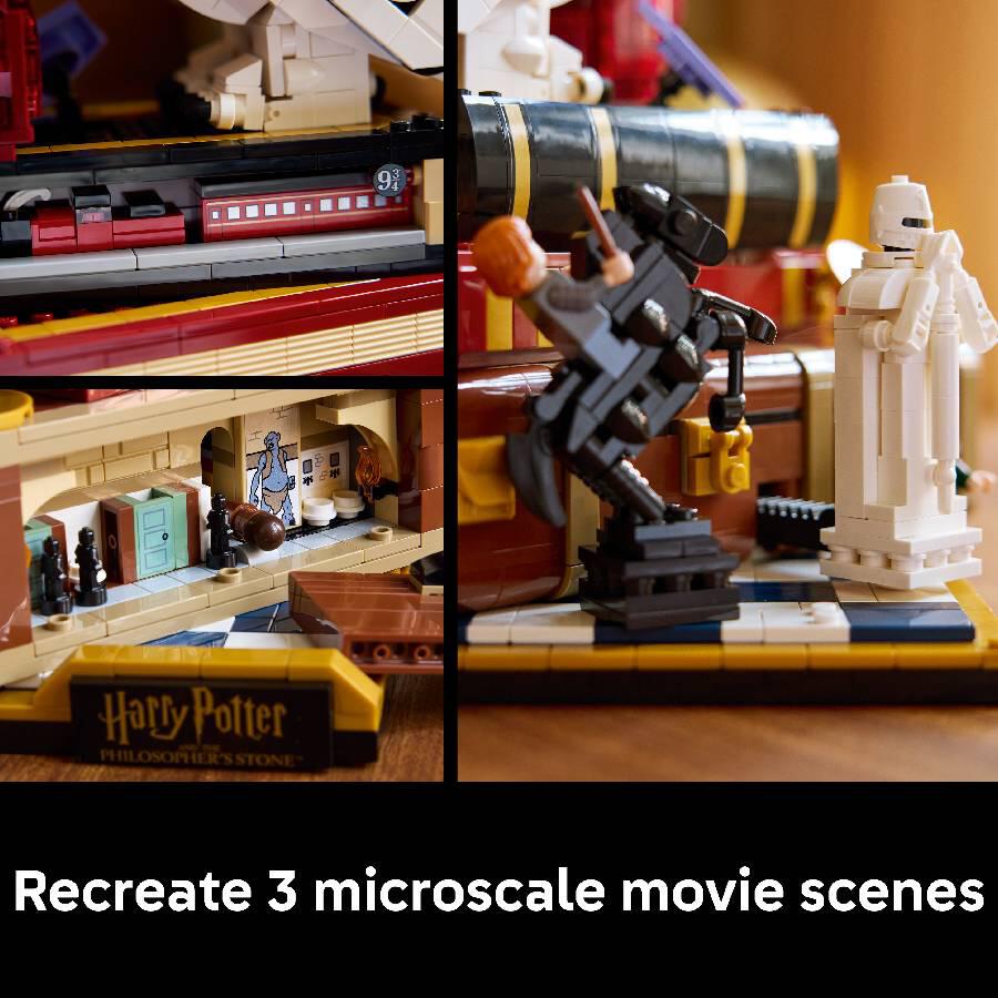 Turn the 3 dials to turn Hedwig’s head, move the Queen on the Wizard Chessboard and blow the side off Harry Potter’s trunk to reveal the mountain troll’s bathroom attack scene. The other microscale scenes depict the Hogwarts™ Express and the 5 trials Harry faces to reach the Sorcerer’s Stone. Set contains 1,571 pieces.