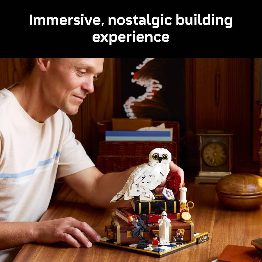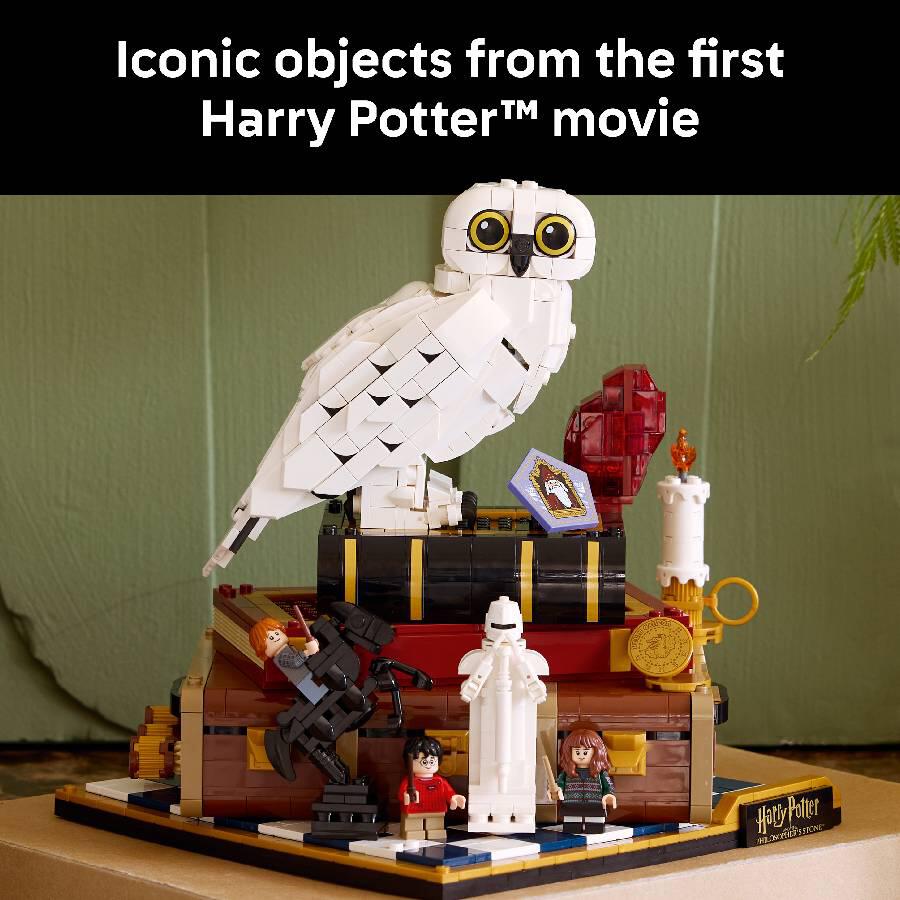 Create the first LEGO Hedwig™ snowy owl figure with closed wings and display her next to the Sorcerer’s Stone on top of Harry Potter’s trunk. Add 3 LEGO Harry Potter minifigures – Harry Potter, Hermione Granger™ and ™ Ron Weasley™ – and items including a Chocolate Frog card and a Wizard Chessboard.