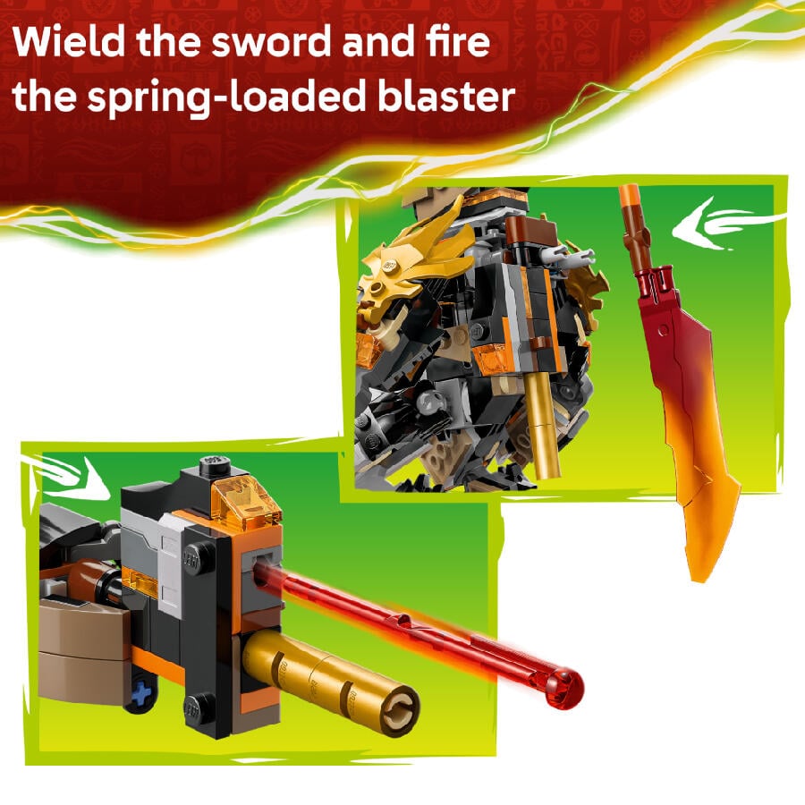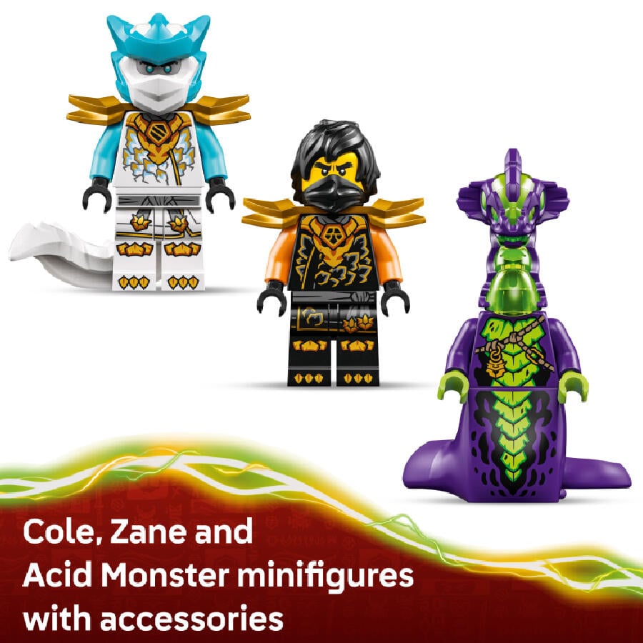 The mech comes with 3 weapons: a sword, a staff and a spring-loaded blaster with 2 darts, which kids can swap with weapons from the Riyu Ninja Dragon (71855) set (sold separately). This NINJAGO toy also comes with 3 minifigures: Cole with a hammer accessory, Zane Dragon Form with a sword and an Acid Monster with a staff for role-play battles.