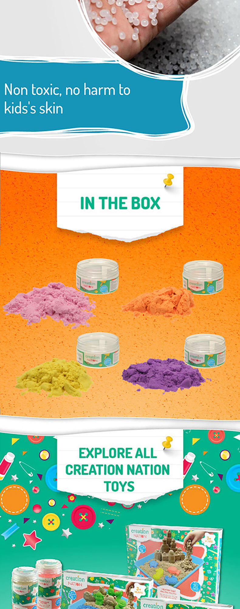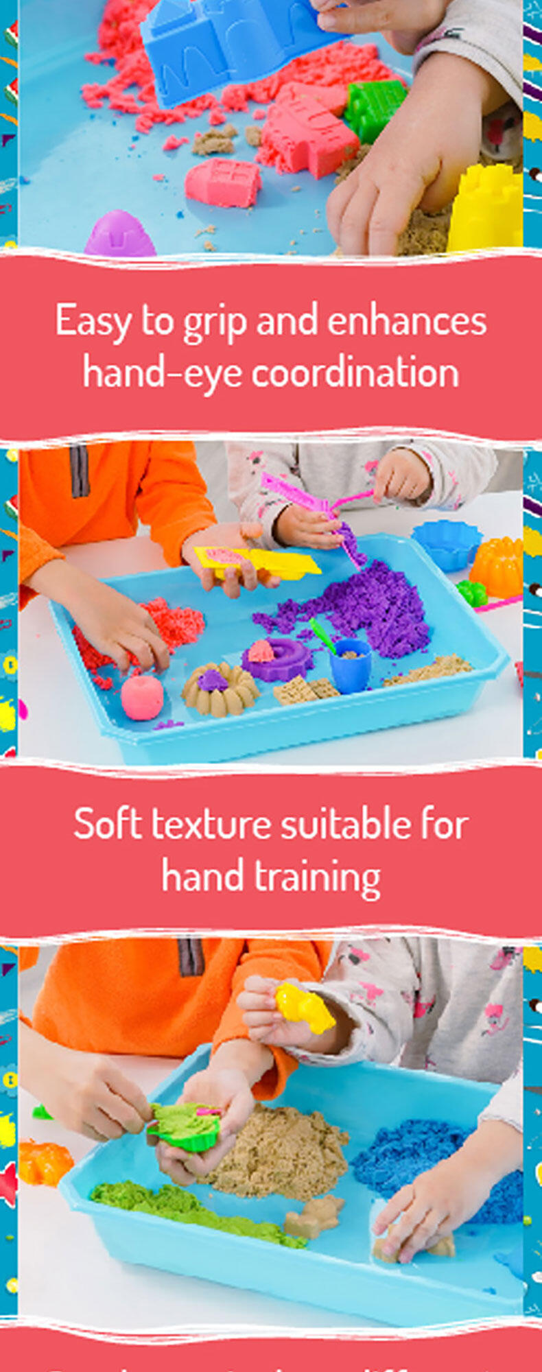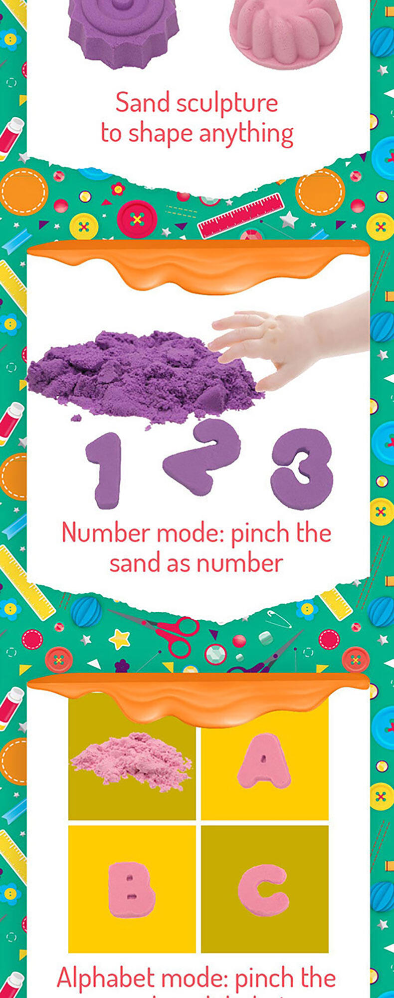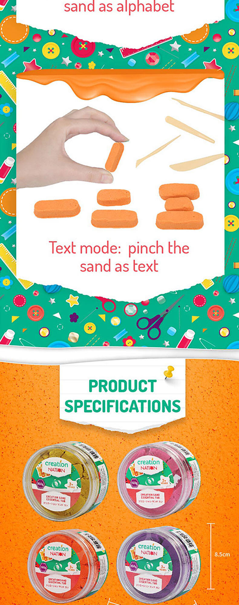 Squish, squash, squeeze! Playing with this magical, sensory-integrated Creation Sand anywhere is the new normal! It's so relaxing when this non-wet, pliable and clean Sand seeps through your fingers. And it's even more satisfying when you seize and shape the Sand to mould your multi-coloured dreamland with endless possibilities.