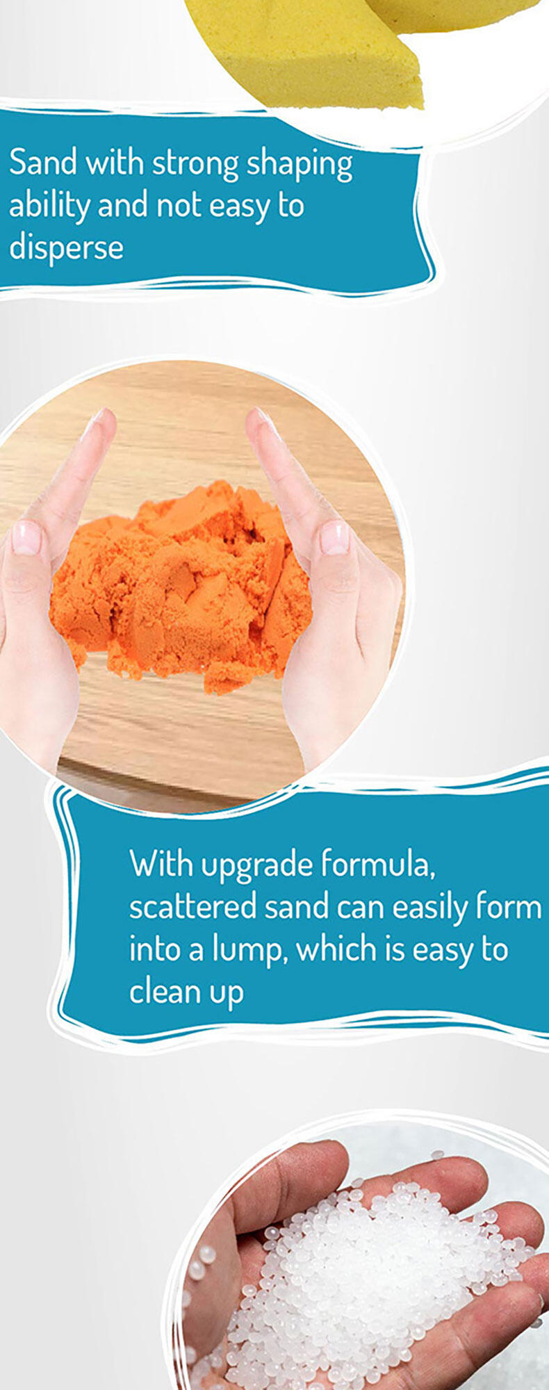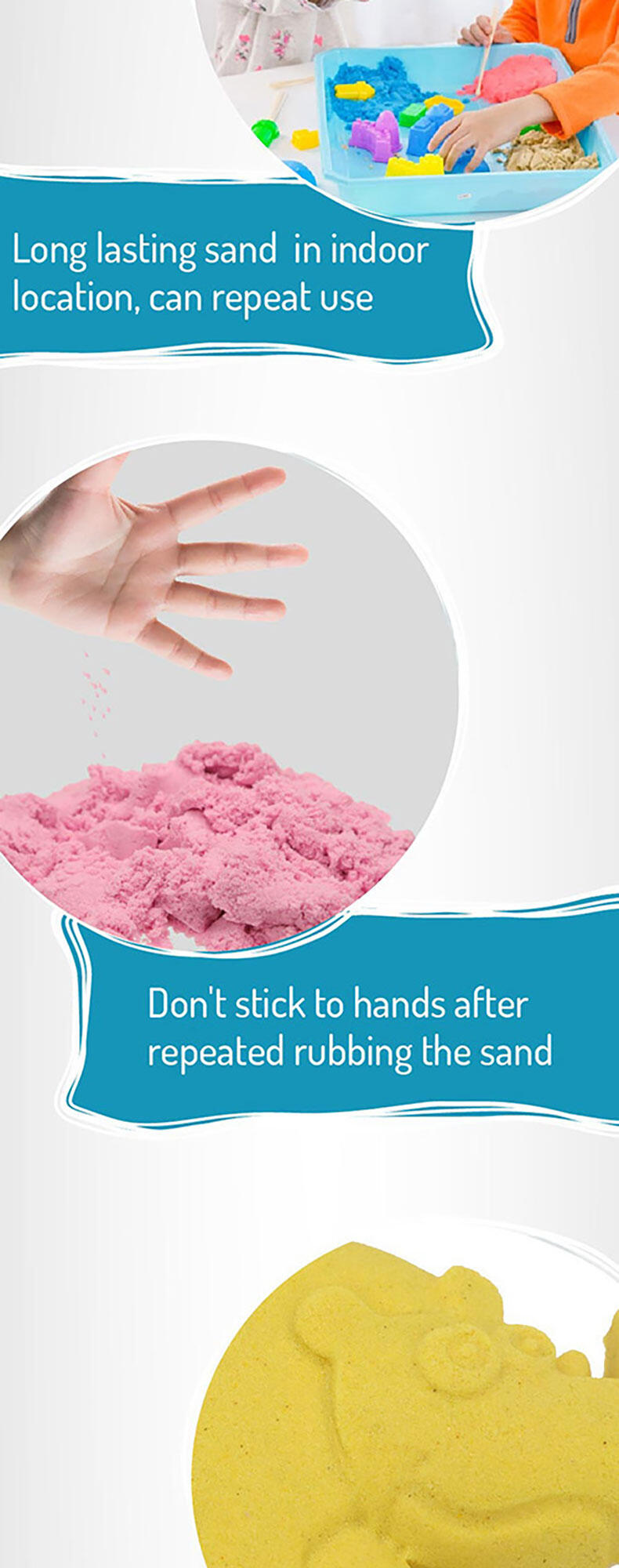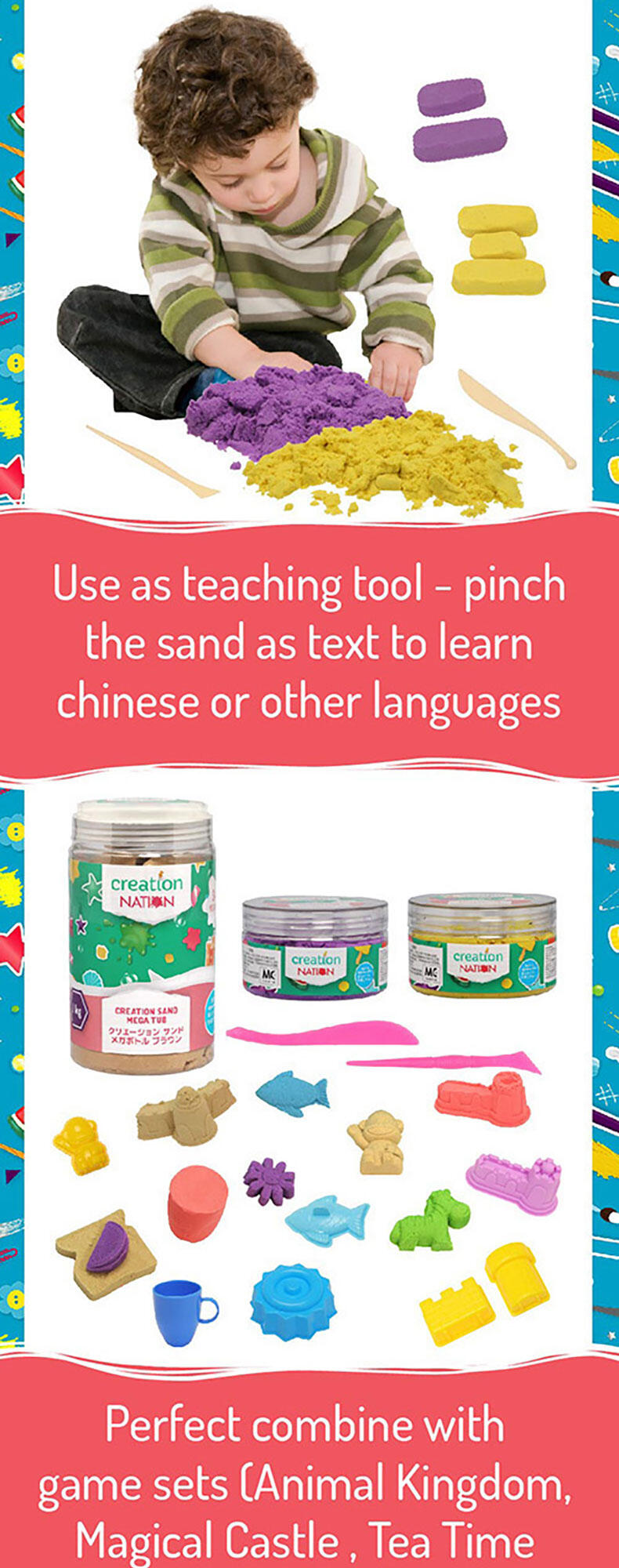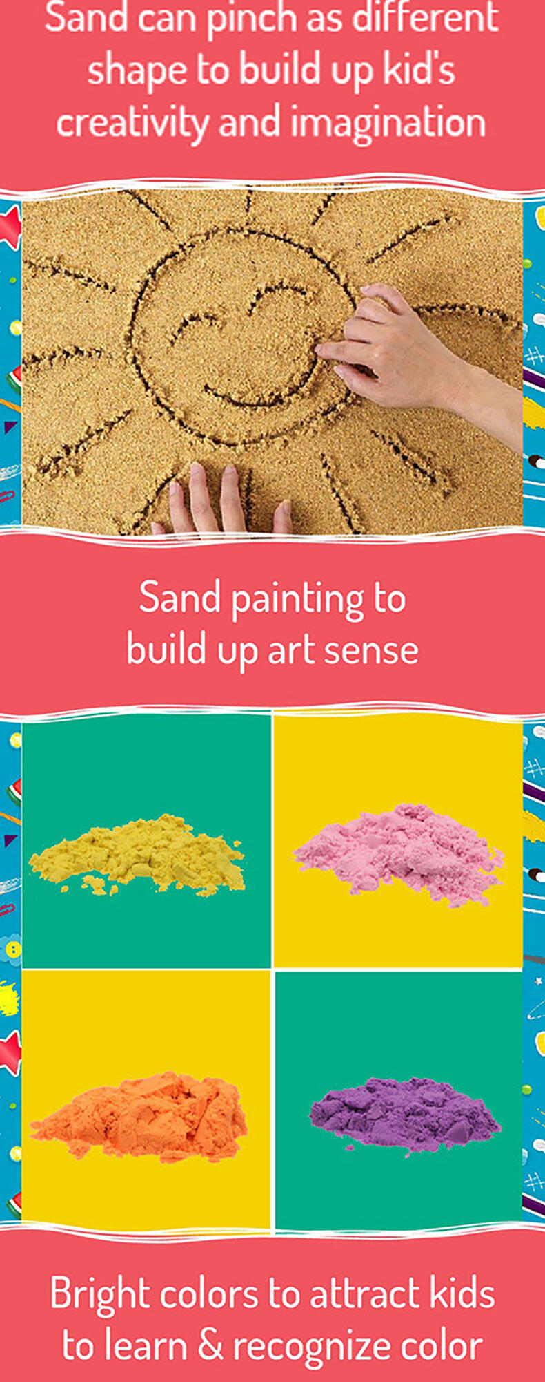 Squish, squash, squeeze! Playing with this magical, sensory-integrated Creation Sand anywhere is the new normal! It's so relaxing when this non-wet, pliable and clean Sand seeps through your fingers. And it's even more satisfying when you seize and shape the Sand to mould your multi-coloured dreamland with endless possibilities.