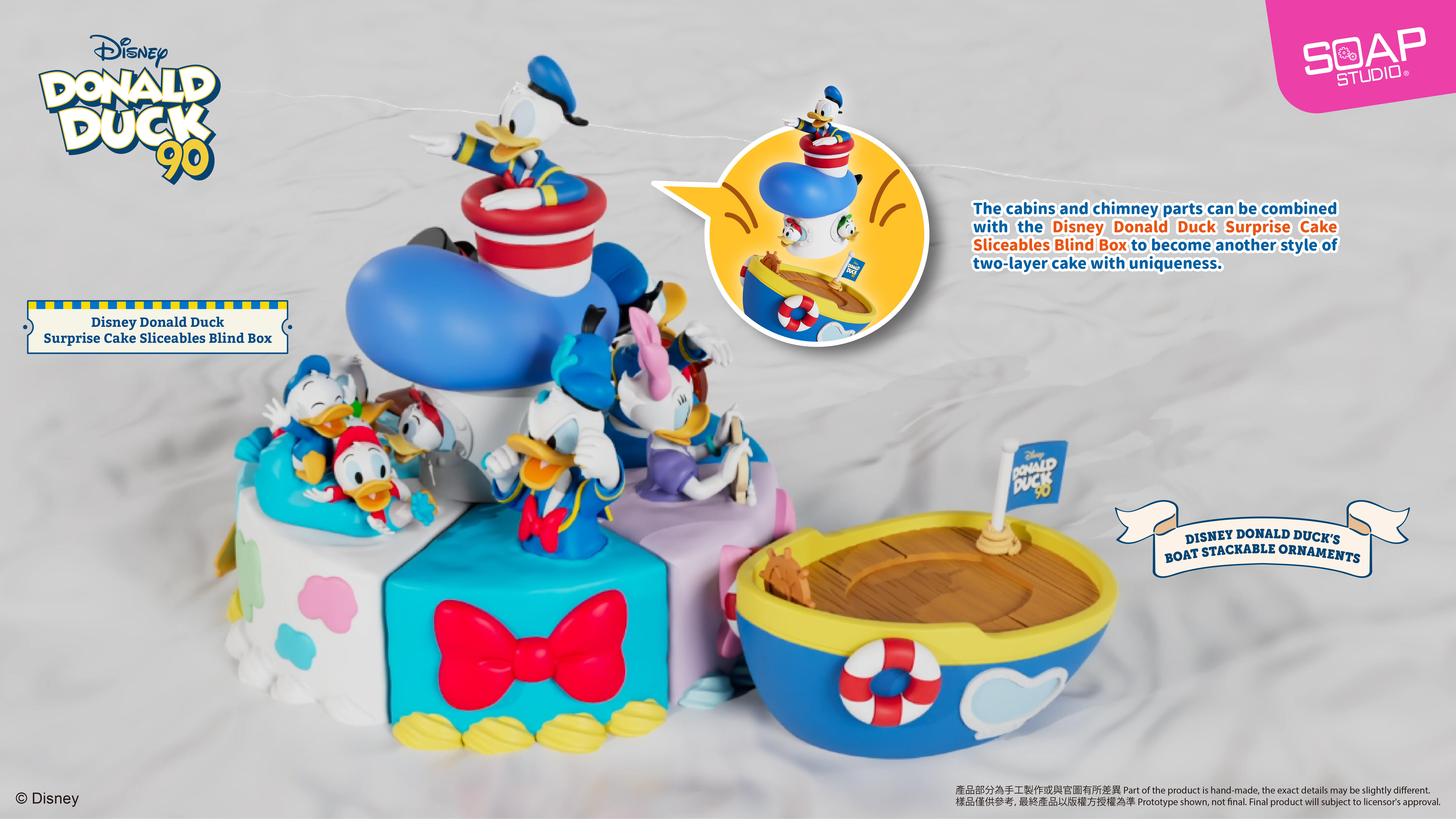 The cabin and the chimney parts can be placed on the top of a complete cake from the Disney Donald Duck Surprise Cake Sliceables Blind Box, which will also be launched at the same time, to make it a two layers cake. It will definitely bring you the joy on both collection and showcasing."