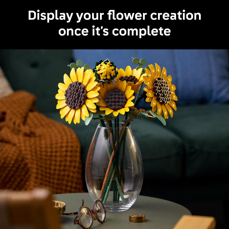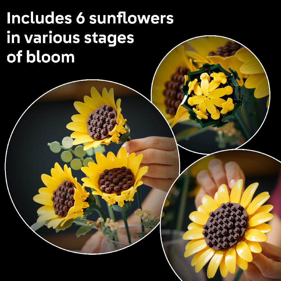 - Let your creativity bloom with the LEGO Botanicals Sunflower Bouquet (11502) building set for adults. This gorgeous LEGO bouquet includes 6 sunflowers in various stages of development. Enjoy creating 1 sunflower bud, 3 sunflowers beginning to bloom and 2 big fully opened sunflowers, plus 4 stems of eucalyptus. These LEGO flowers are designed to be highly realistic and the petals and stems are adjustable so budding florists can arrange the plants into a bespoke bouquet and display it proudly as flower decor. It can also be combined with other LEGO Botanicals sets (sold separately) to create a larger, customized floral display. Sunflowers are thought to represent positivity, love and luck, so this LEGO building kit makes a thoughtful birthday, Valentine’s Day, Mother’s Day or housewarming gift for women, men and nature lovers. It’s also available in the LEGO Builder app, where builders can rotate their builds and track their progress. Set contains 686 pieces.