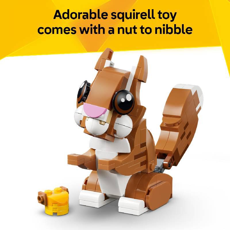 Kids can choose to build a toy dog with a posable head, ears, legs, tail, brows and mouth, which comes with a collar, toy bone and a water bowl. This can be rebuilt into a squirrel toy with a posable head and tail holding an acorn, or a duck model with a posable head and a greenery-filled pond. Once playtime is over, each model can be proudly displayed.