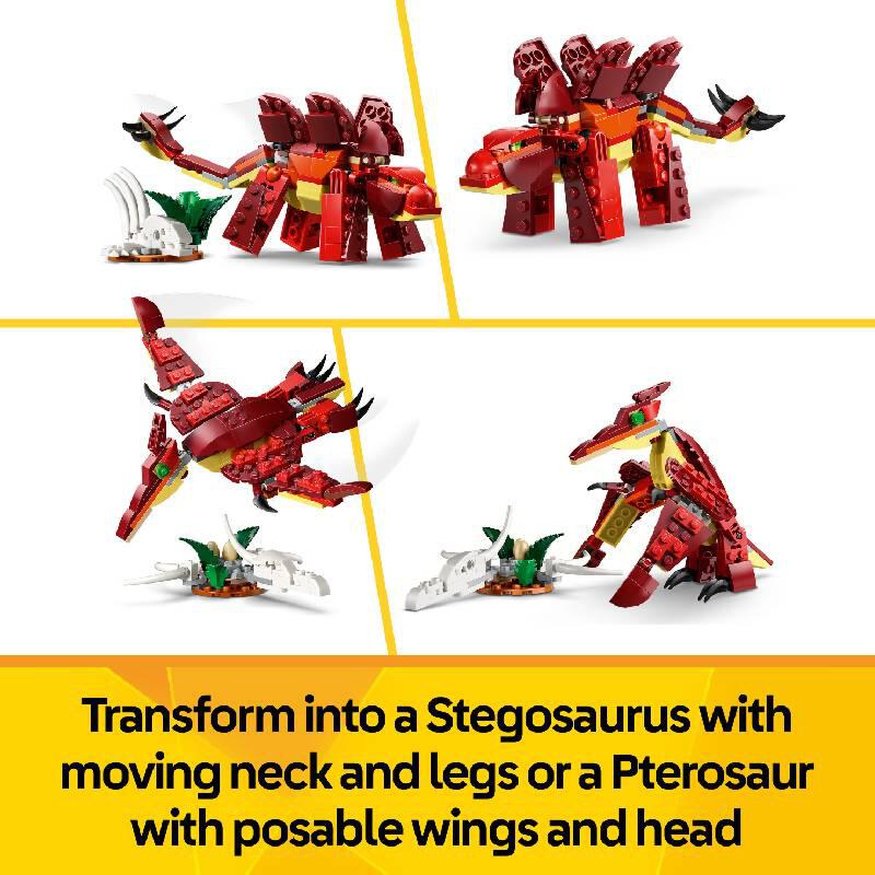 Boys and girls can choose to build a Velociraptor toy with a posable jaw, head, arms, legs and tail. This can then be rebuilt into a Stegosaurus toy that can move its neck, head and legs or a Pterosaur with posable wings, head and feet. Each model also comes with a dinosaur skull and rib cage, dinosaur eggs and a plant. After playtime, each model can be displayed as dinosaur room decor for boys and girls to share with family.