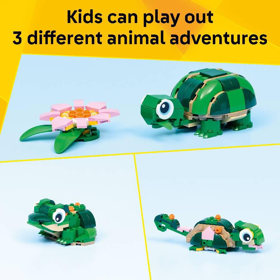 LEGO® Creator 3 in 1 Turtle with a Water Lily Flower (31377) building set lets kids ages 7 and up play out creative animal stories. This cute animal toy for girls and boys offers 3 different building options with the same set of bricks.