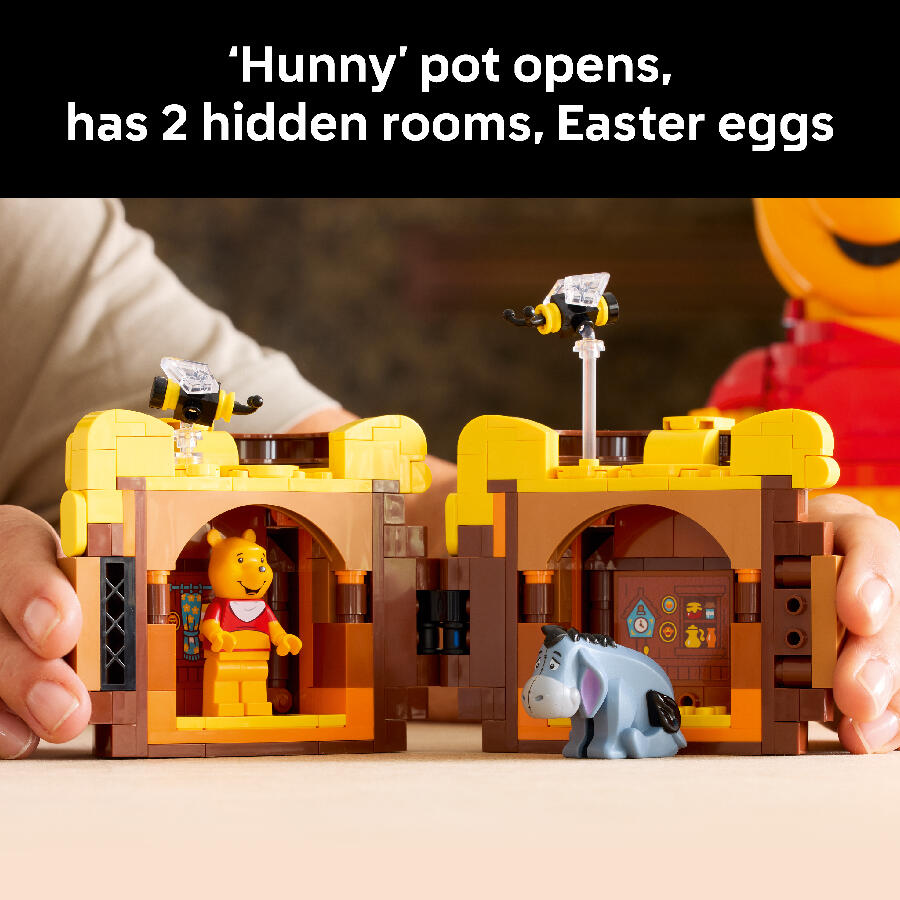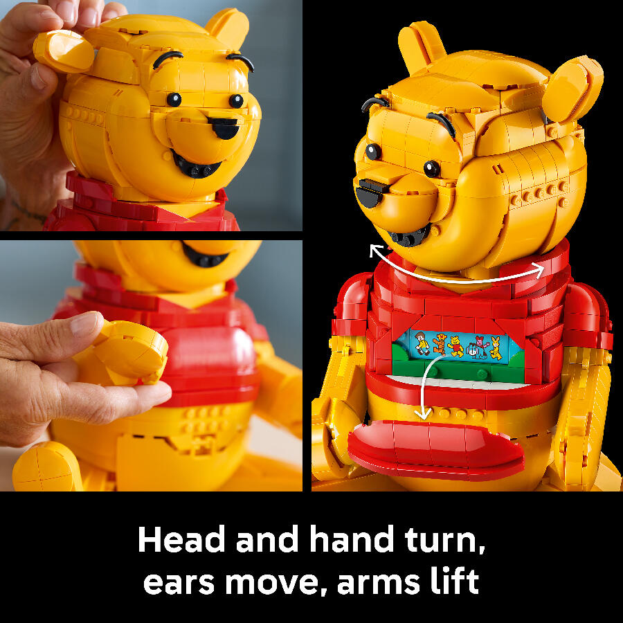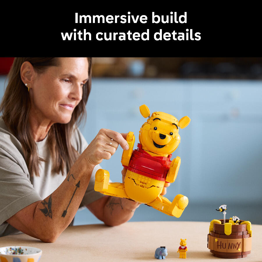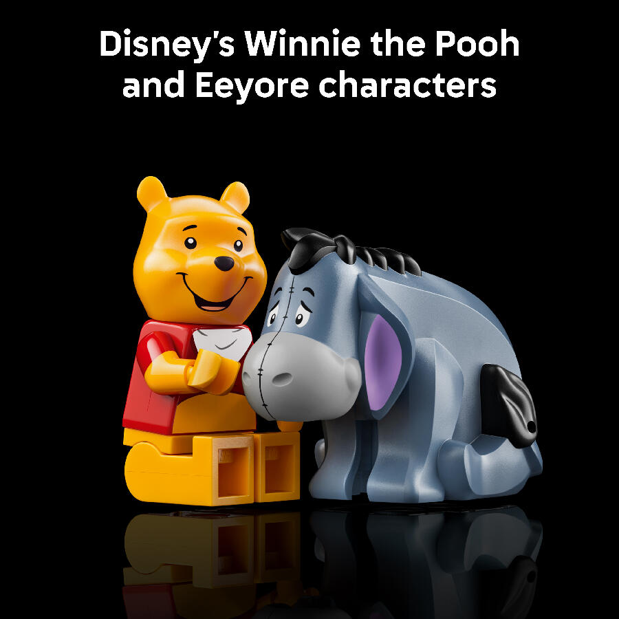 - Disney movie fans can celebrate a milestone with this LEGO ǀ Disney Winnie the Pooh (43300) display model building kit. This commemorative building set, packed with well-known details for adults ages 18 and up, makes a nostalgic home decoration display. It includes a brick-built, classic Winnie the Pooh character, with movable head, ears, arms and hands, and a buildable honey pot. The brick-built model also includes 2 surprises. The ‘Hunny’ pot opens to reveal 2 rooms and holds 2 LEGO ǀ Disney characters: a Winnie the Pooh minifigure and Eeyore character. This Winnie the Pooh gift-giving idea is a great choice for yourself or another fan’s birthday or holiday. The building kit enhances a current collection or lets you build one around the iconic Pooh, his love for ‘Hunny’ and his friends. And as you build, you can collect all your sets in one place: the LEGO Builder app lets you save your sets, zoom, rotate in 3D and track your building progress. Set contains 1,399 pieces.