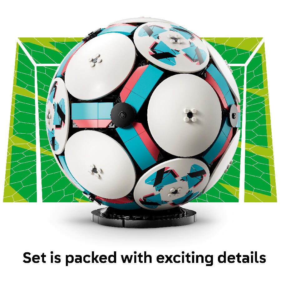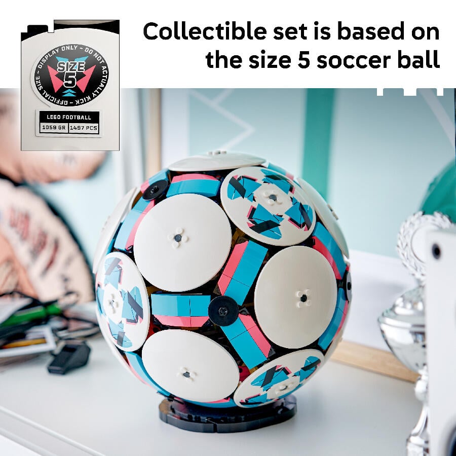 - Kick-off kids’ creativity with the LEGO Editions Soccer Ball (43019) building set for boys and girls ages 10 and up. Packed with awesome details, it lets fans create an almost 1:1 LEGO soccer collectible based on the size 5 ball used in official soccer games. The collectible set includes LEGO Technic™ elements to achieve a rounded shape, and the outside of the ball features 6 stylish deco discs, while inside there’s an exciting mini stadium celebration scene waiting to be discovered. Kids can press the button and watch the moment soccer player figures celebrate a win, with fireworks popping off behind the stage. Other fun stadium details include a small golden trophy toy in the center and big screens. A sports gift for soccer lovers of all ages, the building kit is designed for display and includes a black base that makes it easy to show it off as soccer decor once completed. It’s also available in the LEGO Builder app, where fans can track their progress. Set contains 1,498 pieces.