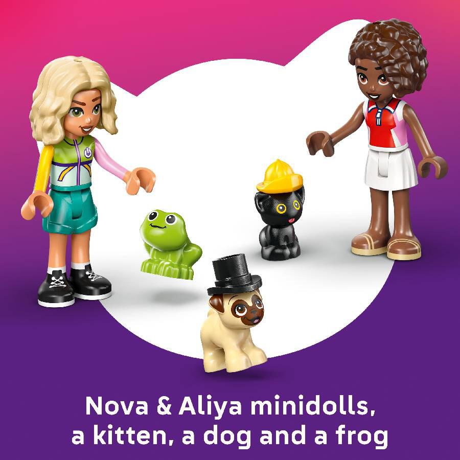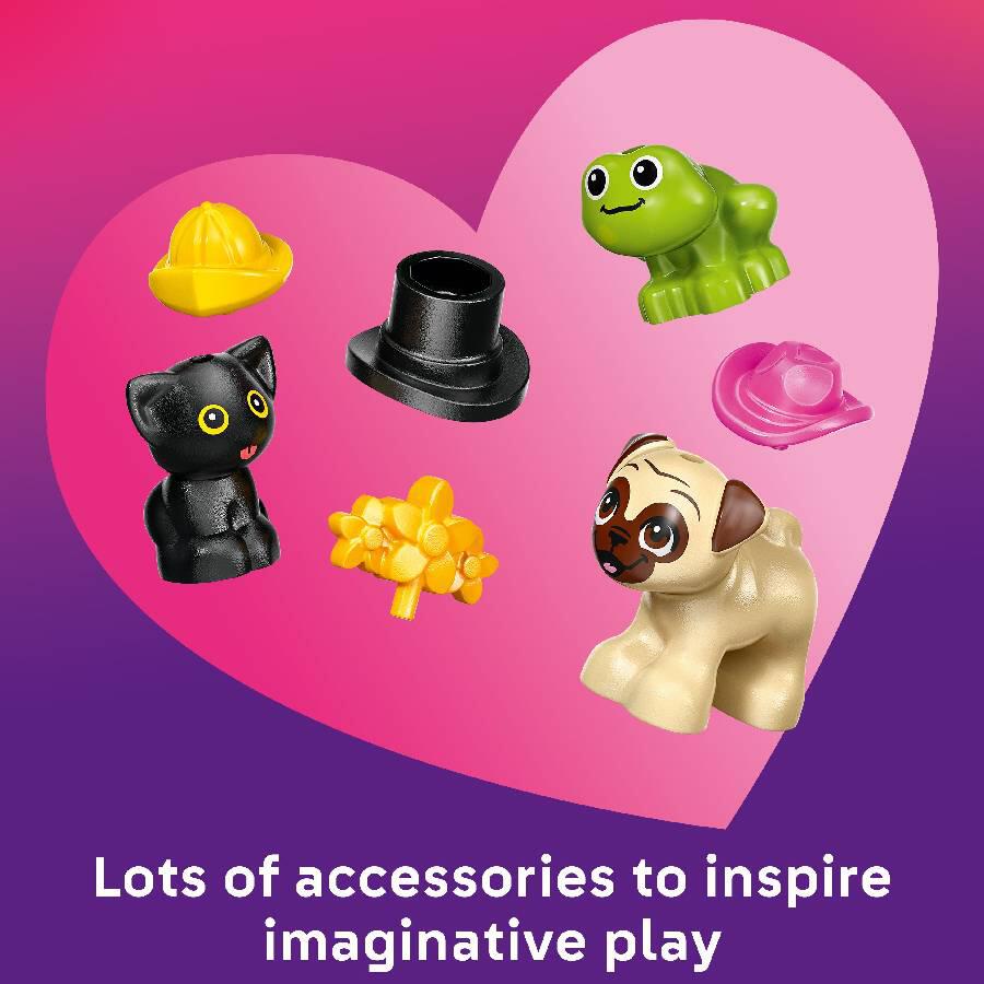 The detailed building set encourages open-ended play with 2 minidolls, kitten, dog and frog animal figures and cute pet accessories. This set is full of fun moments – admire the pug-shaped van and see its tail wag as it drives along! Get creative helping the pets try on different hats including a rain hat, cowboy hat, top hat and flower crown. Check out the cute bone mascot, then load the van with the accessories, ready for the next adventure.