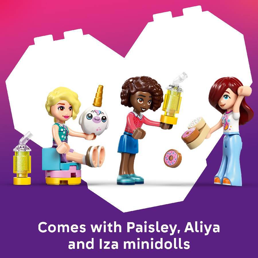 The detailed building set encourages open-ended play with 3 minidolls, toy cakes, donuts, waffles and cookies. There are also cute cupcakes to display in the window or on the turntable. Create more story possibilities with a juice and milkshake bar, indoor and outdoor seating areas, a cash register, and a LEGO unicorn plushie accessory. Young Friends fans can enjoy creative play with café owner Iza and customers Paisley and Aliya.