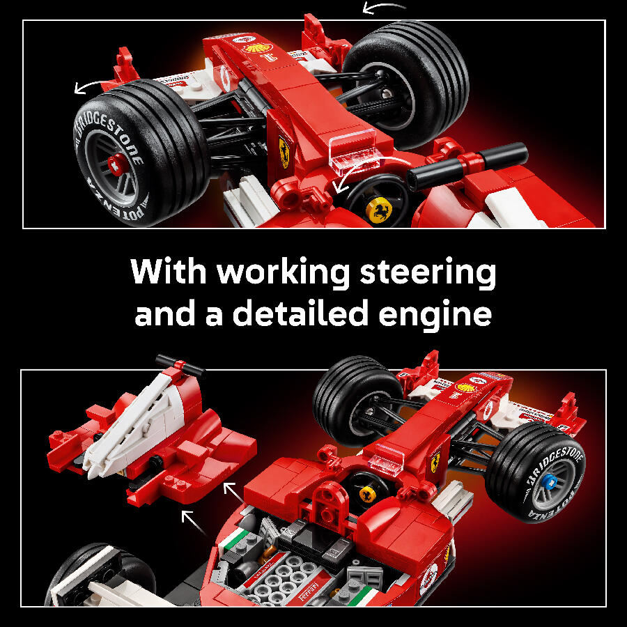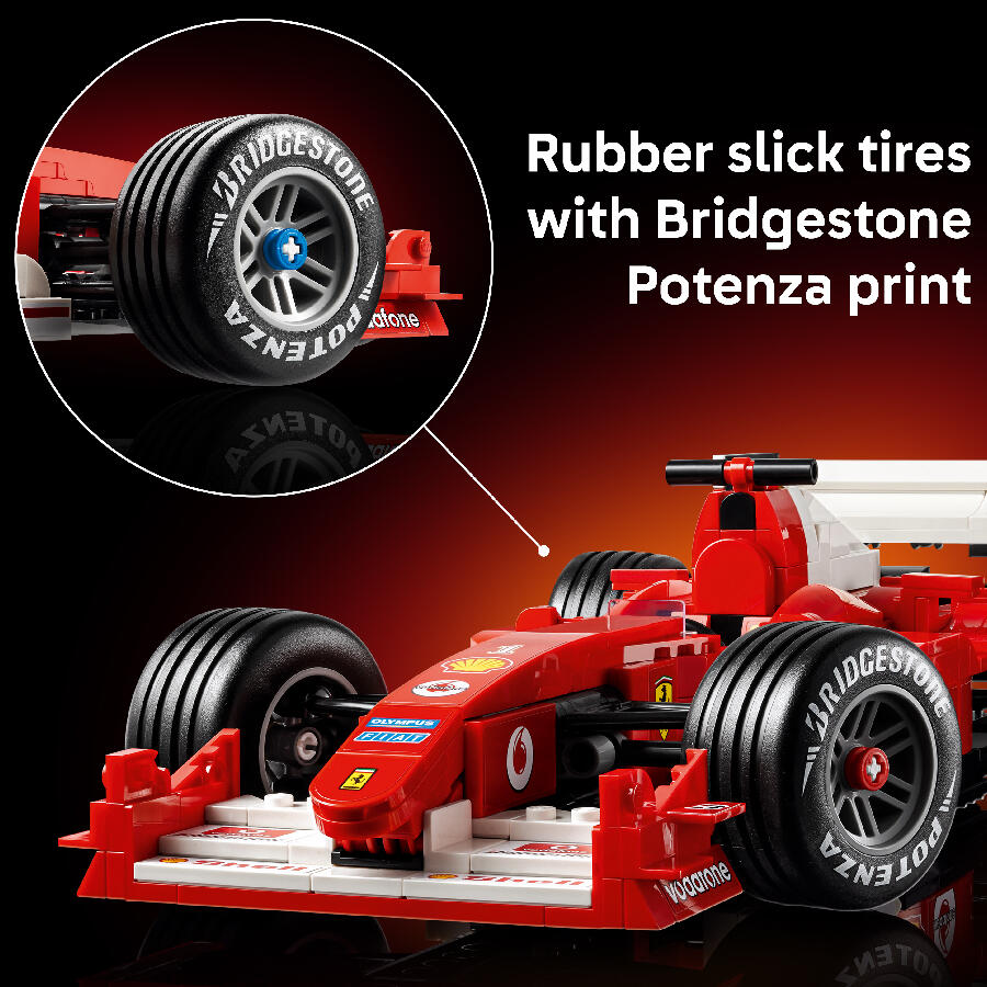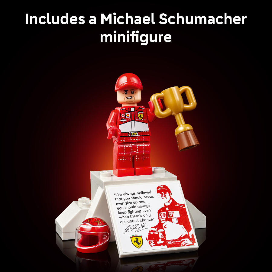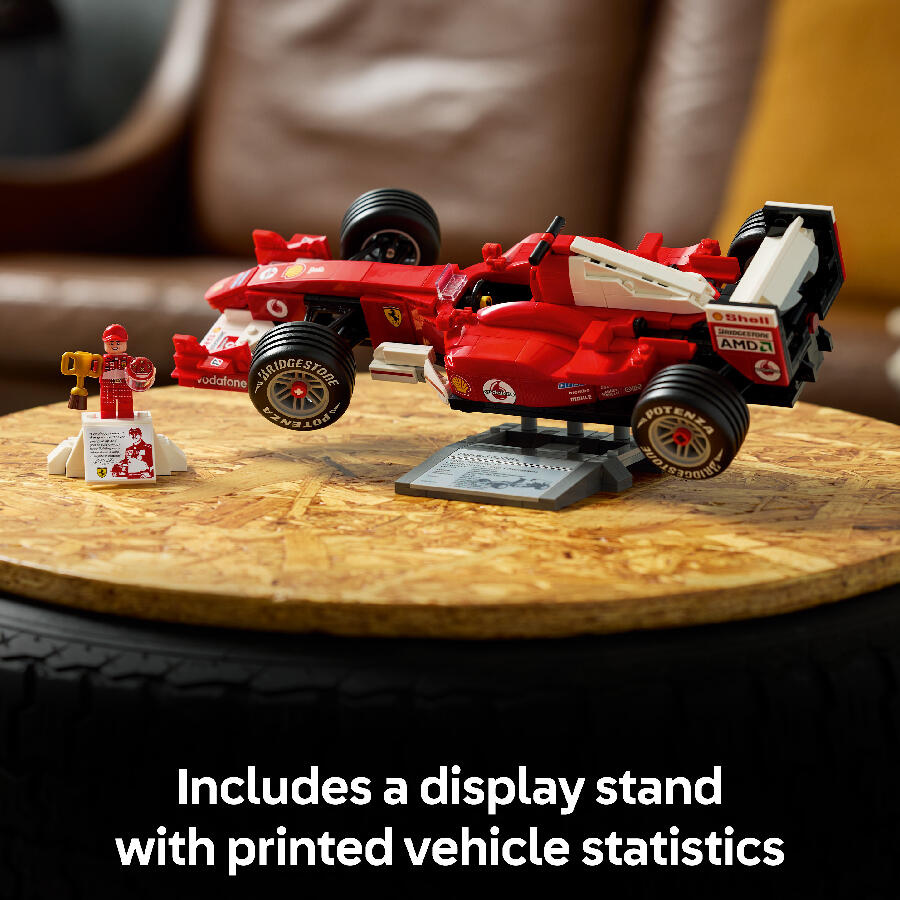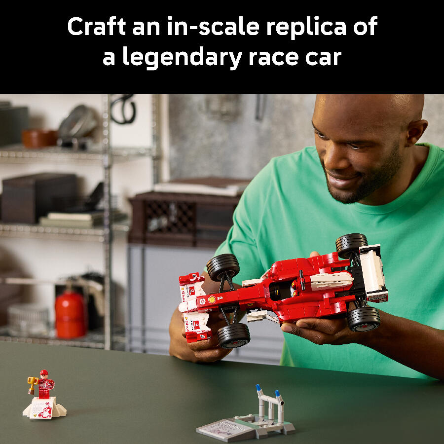- Celebrate a golden era of Formula 1 racing with the LEGO Icons Ferrari F2004 & Michael Schumacher (11375) model car kit. Craft an in-scale replica of the legendary race car that, with Michael Schumacher at the wheel, dominated the 2004 racing season. The model Ferrari features working steering, grooved slick tires and a detailed V10 engine, plus a display stand with vehicle details and stats. The Michael Schumacher minifigure comes with a helmet, winner’s trophy and a podium-style display stand with a printed image and a quote from the seven-time world champion. This premium display model makes a captivating centerpiece and a great holiday or birthday gift for fans of F1 racing and collectors of F1 merchandise. Discover the dynamic range of LEGO F1 building sets (sold separately) designed for adults, kids and families. Build smarter with the LEGO Builder app – zoom, rotate in 3D, track your progress and follow step-by-step digital instructions. Set contains 735 pieces.