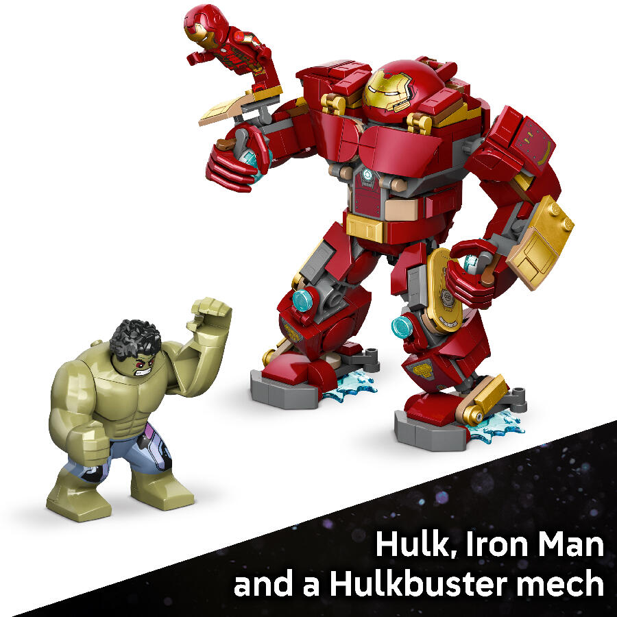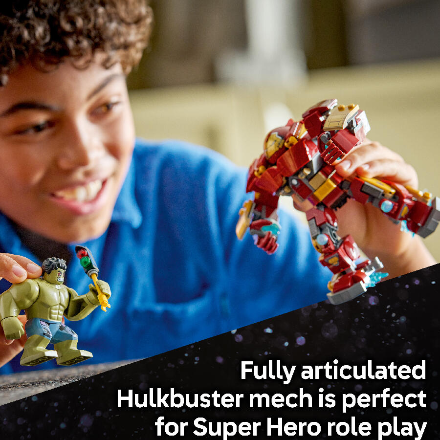 Iron Man battles Hulk, with the help of his Hulkbuster armor, amid a street scene filled with debris, collapsing steel structures and a traffic light, which Hulk can use as a weapon. The Hulkbuster is fully jointed to maximize posability. With a sturdy base and nameplate, kids can use their model as room decor or detach the minifigures to create Super Hero adventures of their own. This set makes a great gift idea and, with the LEGO Builder app, kids can build with confidence – zoom, rotate in 3D and track progress with easy-to-follow digital instructions. Building set contains 413 pieces.