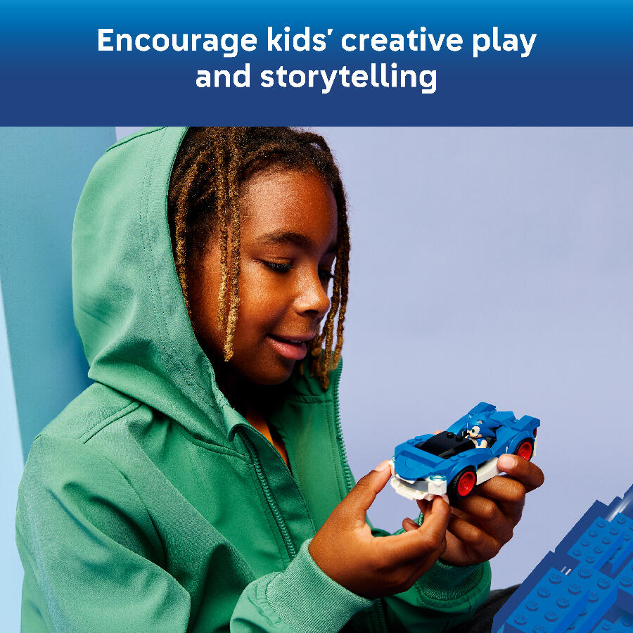 Fast-paced, race car adventures await kids ages 7 and up in this LEGO® Sonic the Hedgehog™ Sonic: Speedster Lightning (77117) building toy set. Based on the Sonic Racing: CrossWorlds console video game, boys, girls and gaming fans can race around and collect the 3 Gold Rings with a Sonic minifigure with mischievous face decoration. The blue-and-white interactive toy vehicle in this LEGO gaming set features wide, red-rimmed tires and an opening hood that reveals a hidden Chaos Emerald gem.