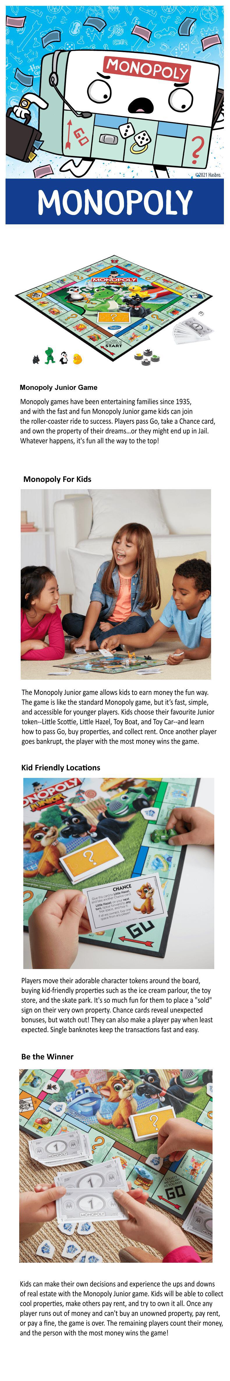 • Fast-trading Monopoly Junior game is for younger players• Game is like the classic Monopoly game but easier for kids