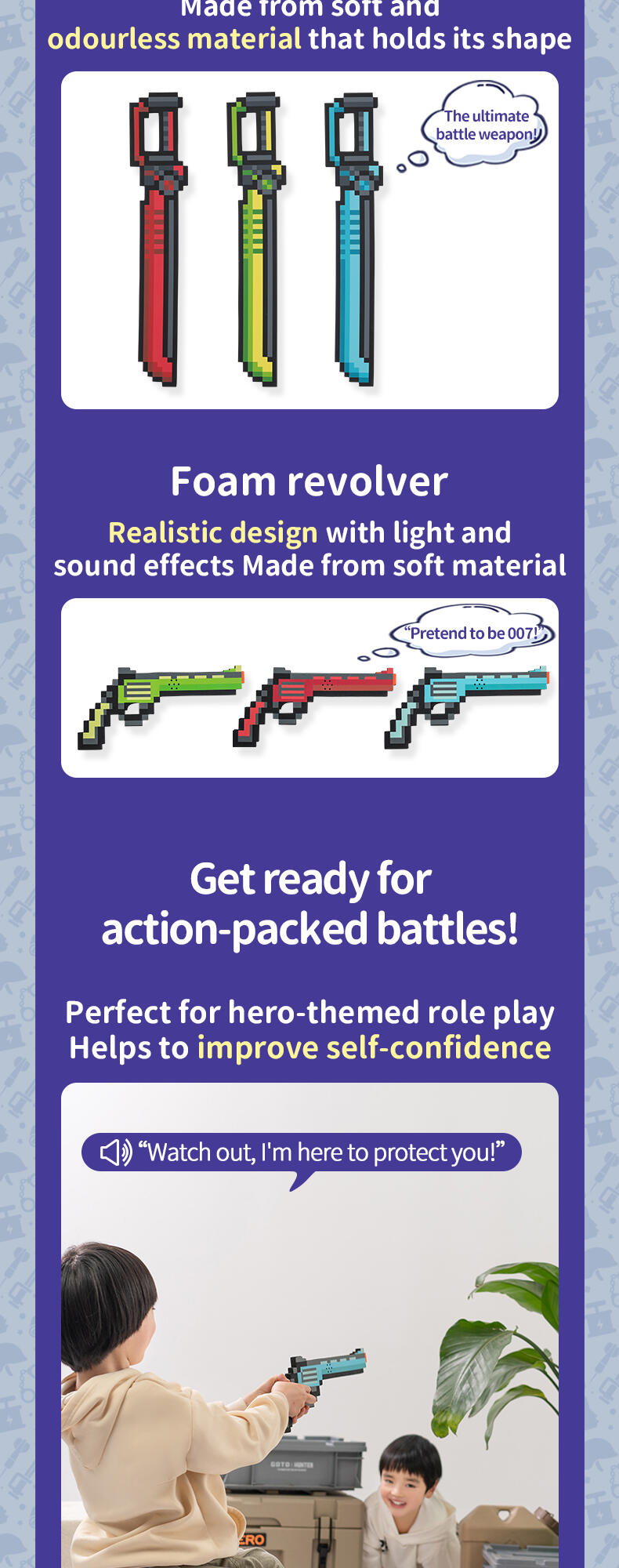 Dive into the pixelated world where your little one can protect their built up creations. Made out of high quality safe EVA foam, this toy is safe for playing. The perfect gift for building block gamers and their pixel adventures! How will this pixelated story end?