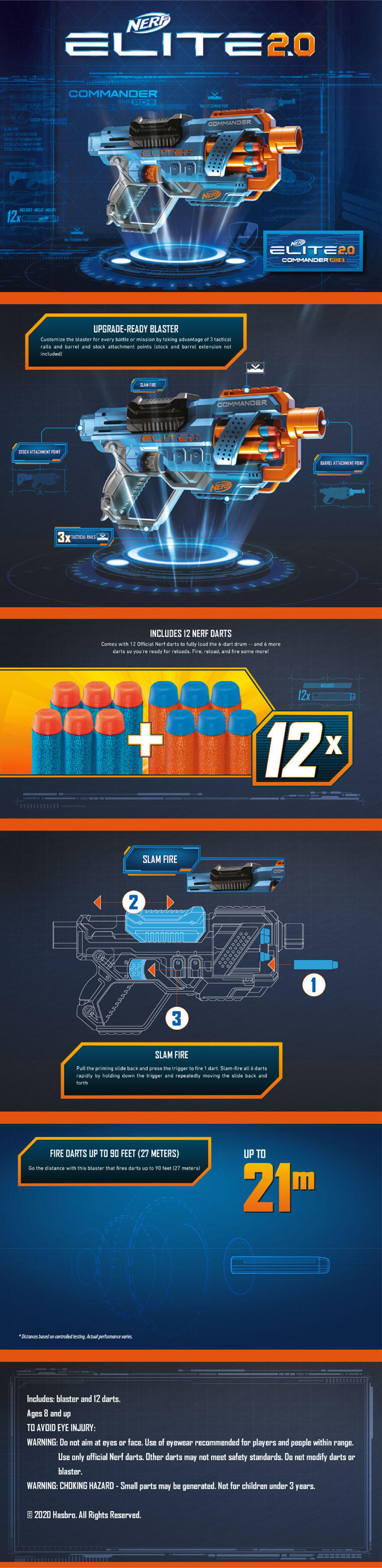 The Nerf Elite 2.0 Commander RD-6 blaster has 3 tactical rails, a barrel attachment point, and stock attachment point to customize the blaster for every Nerf game. The blaster has a 6-dart rotating drum so you can fire multiple darts before reloading. Fire 1 dart at a time, or launch all 6 darts rapidly with slam-fire action. Barrel extension and stock not included. includes 12 Official Nerf darts -- enough to fully load the drum, and 6 darts to keep nearby for reloads. Fires darts up to 90 feet (27 meters). Eyewear recommended (not included). No batteries required.