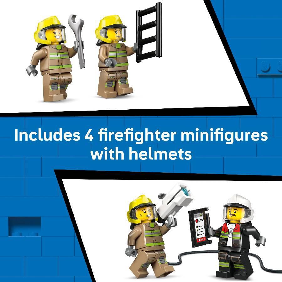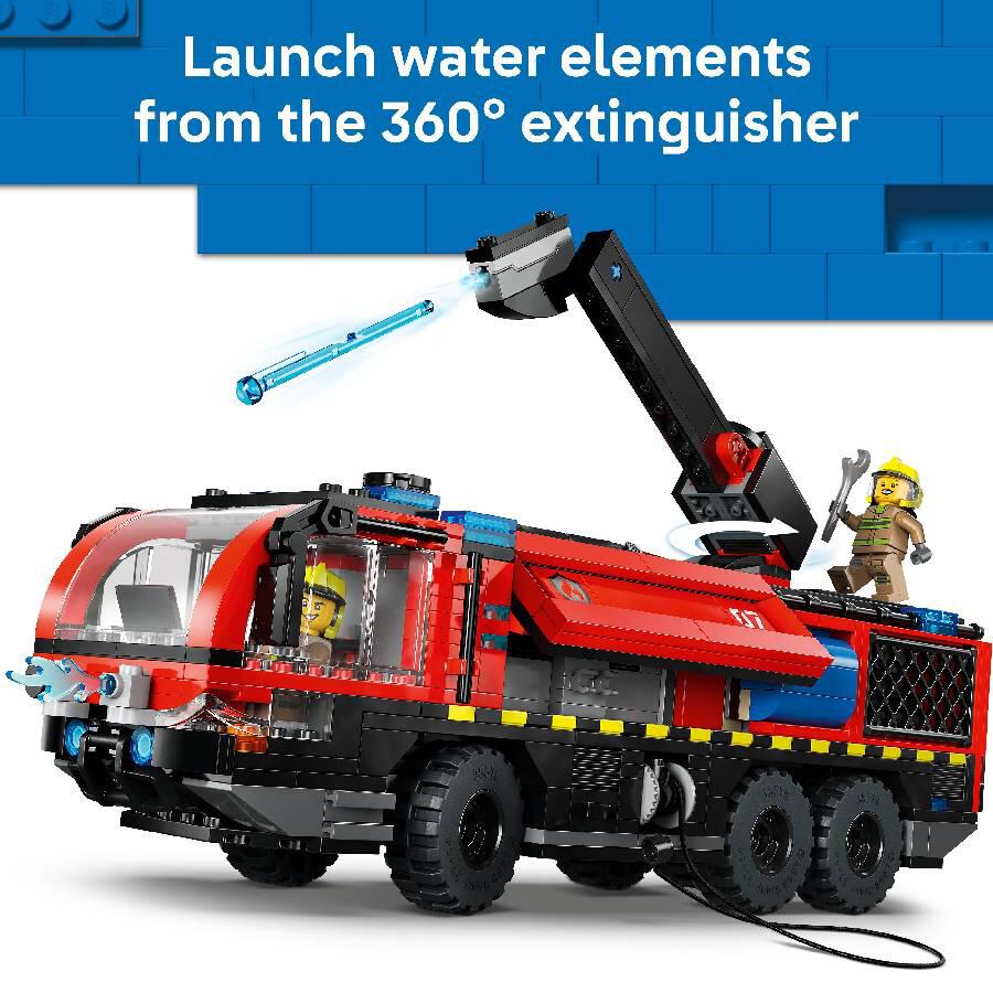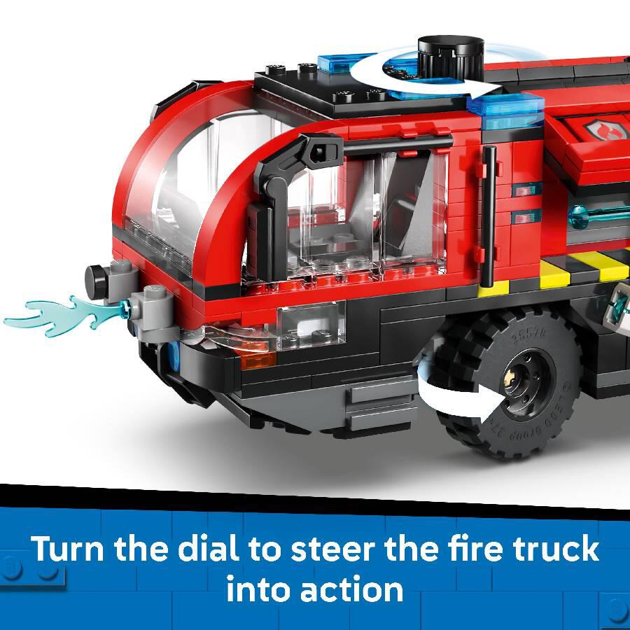 Mobilize the LEGO® City Airport Fire Truck (60499) for kids ages 7 and up. This realistic emergency vehicle toy features a 360° rooftop extinguisher, opening side equipment bays and tool storage compartments. Kids can turn a dial to steer the truck, launch water elements from the extinguisher and remove the engine for repairs. The toy truck comes with 6 chunky rubber tires and a detailed cab with seating for the 4 firefighter minifigures. Just add a sprinkle of imagination to ignite hours of heroic firefighting adventures.