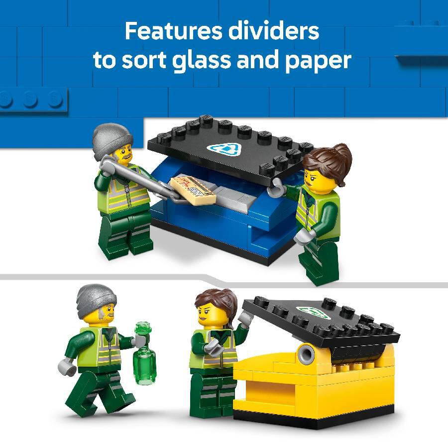 This LEGO® City Recycling Truck toy building set (60495) is packed with realistic details for imaginative play. The toy truck has a divider to sort the LEGO glass and paper elements, plus storage clips for tools and a detailed driver’s cab. Kids can tilt the cab to view the pretend electric motor, push a lever to lift and empty the 2 dumpsters into the truck and raise the container to tip the sorted waste through either of the 2 rear hatches. Just add the driver and worker minifigures and let the adventures begin.