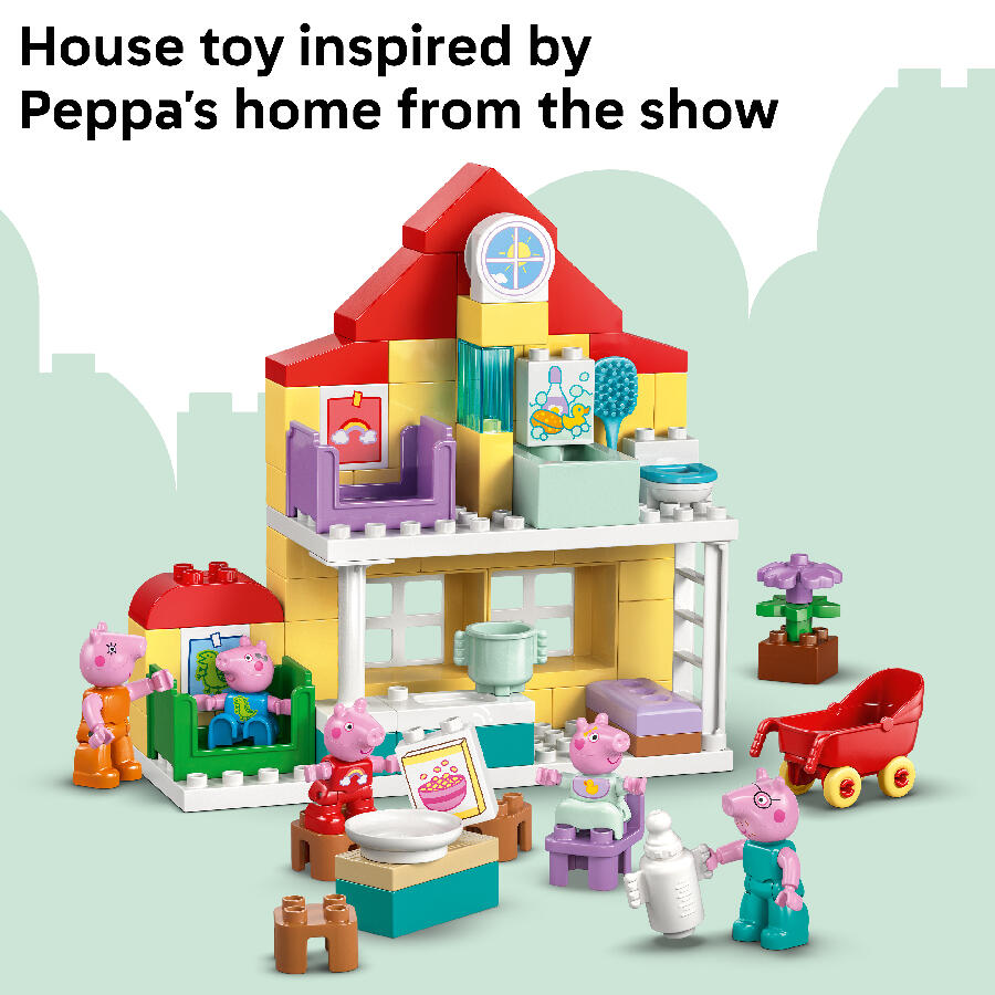 - Toddlers play out routines alongside their favorite TV characters with the Peppa Pig Family House (10467) building kit. This toddler gift for girls and boys ages 2 and up includes the full family of 5 Peppa Pig characters including Evie Pig. Like in the show, this 2-level LEGO DUPLO toy house has separate rooms for George and Peppa Pig, a kitchen, bathroom and lounge. This pretend play toy encourages young girls and boys to recreate scenes from the show and routines from their own home, such as getting ready for bed, or having a family breakfast. With this building set’s 5 LEGO DUPLO figures – Mummy Pig, Daddy Pig, George, Evie and Peppa Pig – kids can grow their emotional intelligence as they imagine having a new family member. Packed with accessories for imaginative play, this toddler learning toy lets little builders imagine caring for the baby by taking her for a walk in the stroller, feeding her with the bottle or giving her a bath. Contains 84 pieces.