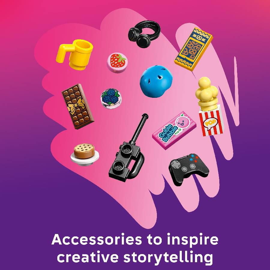 This building set comes with 5 minidolls plus a cat, gecko and bunny. There are also lots of accessories to fuel kids’ imaginations including pet bowls and water, a popcorn machine, a gaming TV with controllers, a fridge, donuts, strawberries, waffles and more.