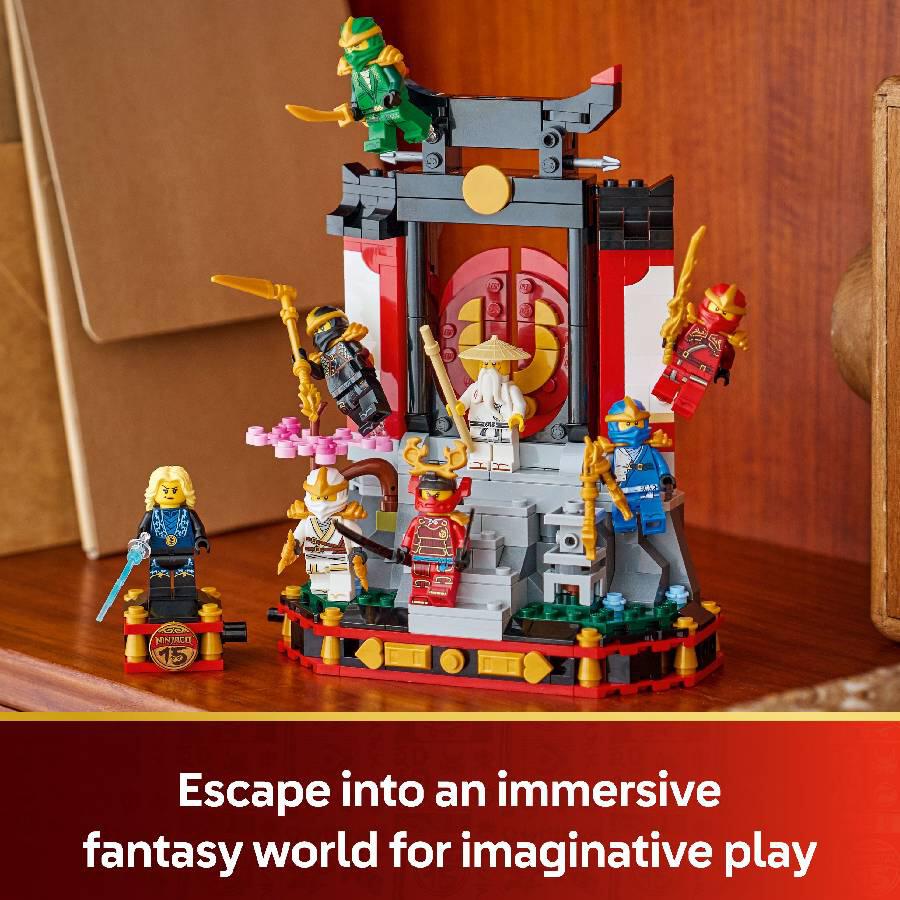 Boys, girls and nostalgic ninja fans ages 14 and up can celebrate the 15th anniversary of the LEGO® NINJAGO® TV show with this Ninja Character Display 15th Anniversary (71866) set packed with 8 minifigures. This great value ninja toy monastery features steps, an opening gate, a stone lantern, a cherry tree covered in blossom, and a tearoom at the back with stickers depicting a famous NINJAGO battle.