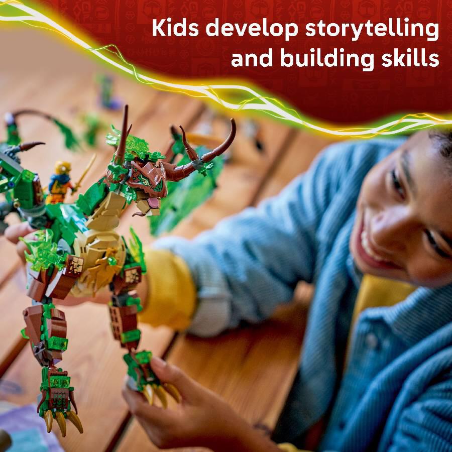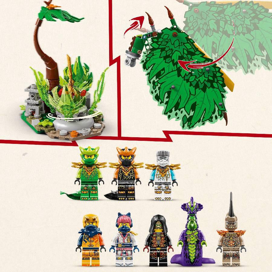 The playset includes a side build with a tree and a plant kids can spin around that hides a golden sword accessory, plus a posable mini mech toy with a cockpit for a minifigure. To role-play epic battles, there are 8 minifigures: ninja Zane, Sora, Arin, dragon form Lloyd and dragon form Cole and the villainous trio of Acid Monster, Earth Monster and Loyalist Leader.