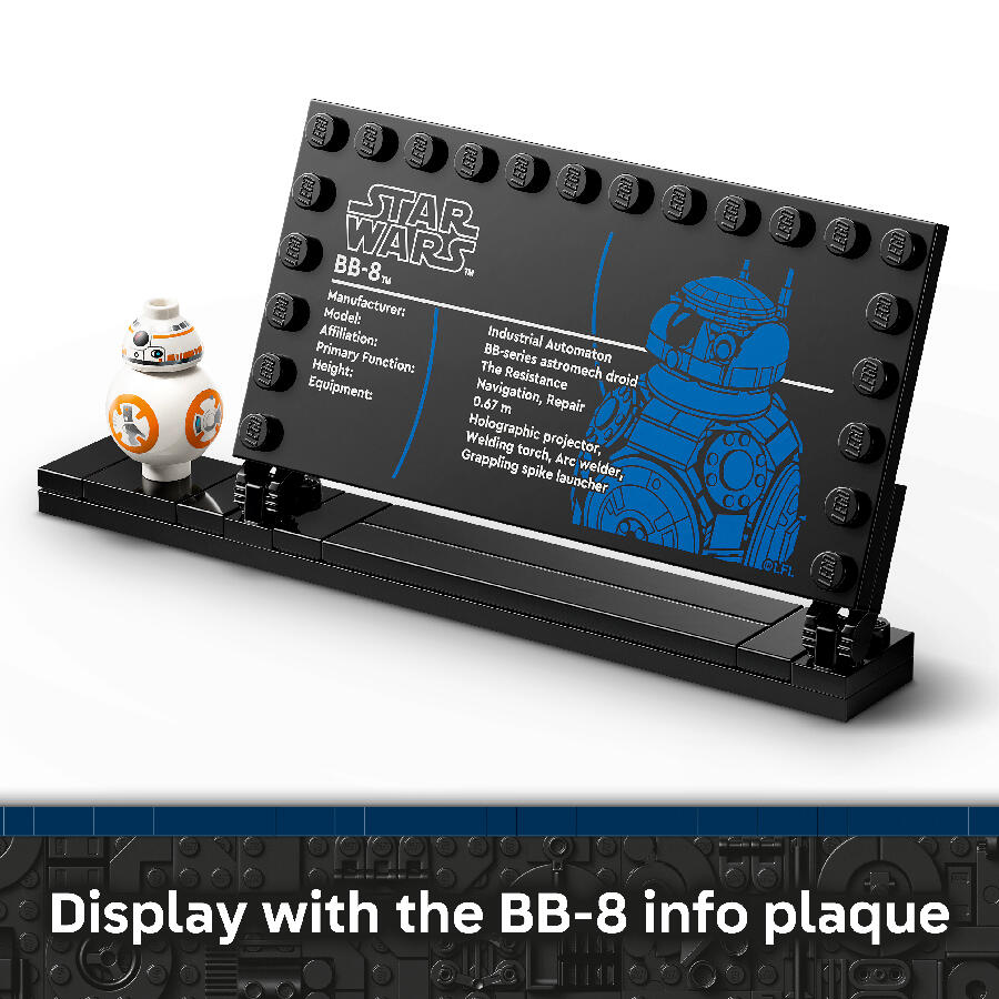Place the buildable model alongside the BB-8 info plaque and standard-size BB-8 LEGO figure to create adorable Star Wars decor that will bring a smile to any fan’s face.