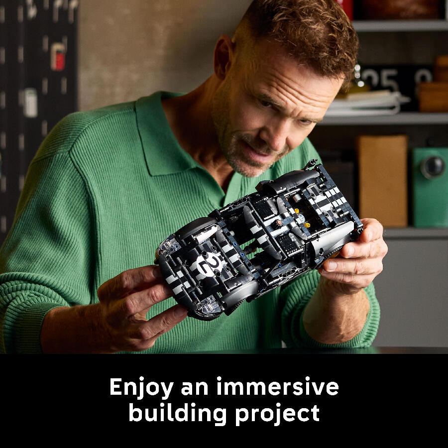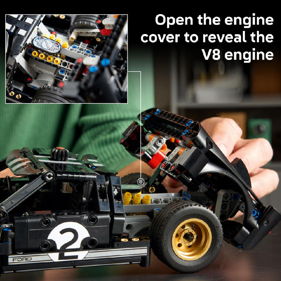 Have fun exploring the detailed features of the set. Use the knob on top of the car to steer. Check out the opening doors and admire the black and silver livery that’s inspired by the real-life champion car. Open the engine cover to reveal the V8 engine, then use the lever inside to open the hood. After you’ve built it, you can proudly display your race car in any room or office.