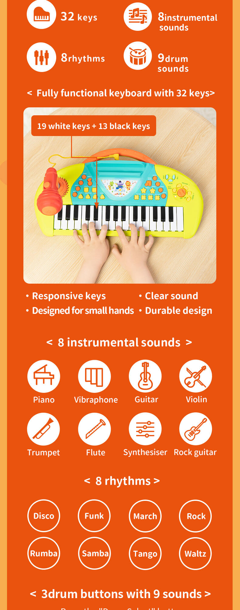Programmed with multiple instrumental sounds, songs and rhythms, the Karaoke Keyboard is a great creative companion for solo play or with friends. The microphone and stand allow your child to record and playback their performance.
